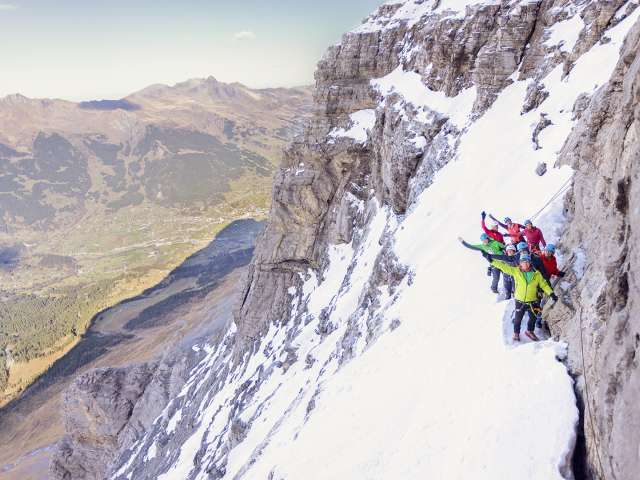 Gerne erzählen euch bei dieser Gelegenheit eure Begleitpersonen von OUTDOOR alles Wissenswerte über das Drama und das Spektakel der Erstbesteigung der Eigernordwand und zeigen euch das damals verwendete Klettermaterial im Gegensatz zum heute Üblichen. Ihr werdet staunen. In der 2'000 m hohen Eigernordwand erwartet euch eine 600 m tiefe Aussicht ins Tal. Im Anschluss an das einmalige Erlebnis in der Eigernordwand fahrt ihr nach Wunsch entweder weiter mit dem Zug aufs Jungfraujoch oder ihr kehrt mit Zug und/oder Gondelbahn nach Grindelwald zurück.