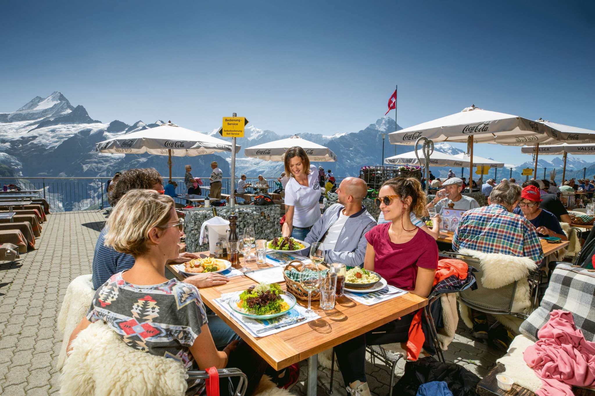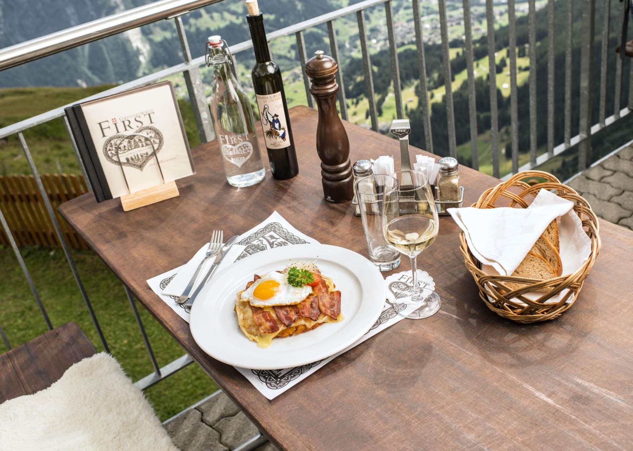Direkt neben der Gondelstation First, auf 2200 m ü. M., befindet sich das Berggasthaus First mit seinem atemberaubenden Ausblick auf die umliegende Bergwelt. Auf der Sonnenterrasse und im Restaurant geniesst du den ganzen Tag köstliche Gerichte.