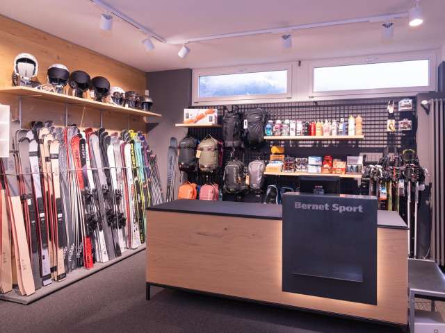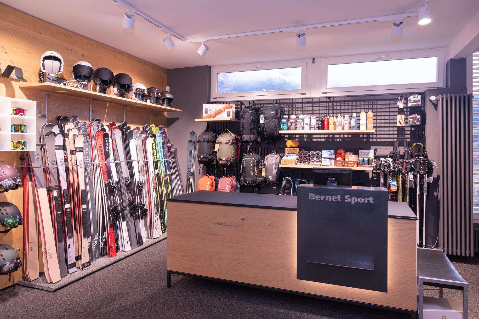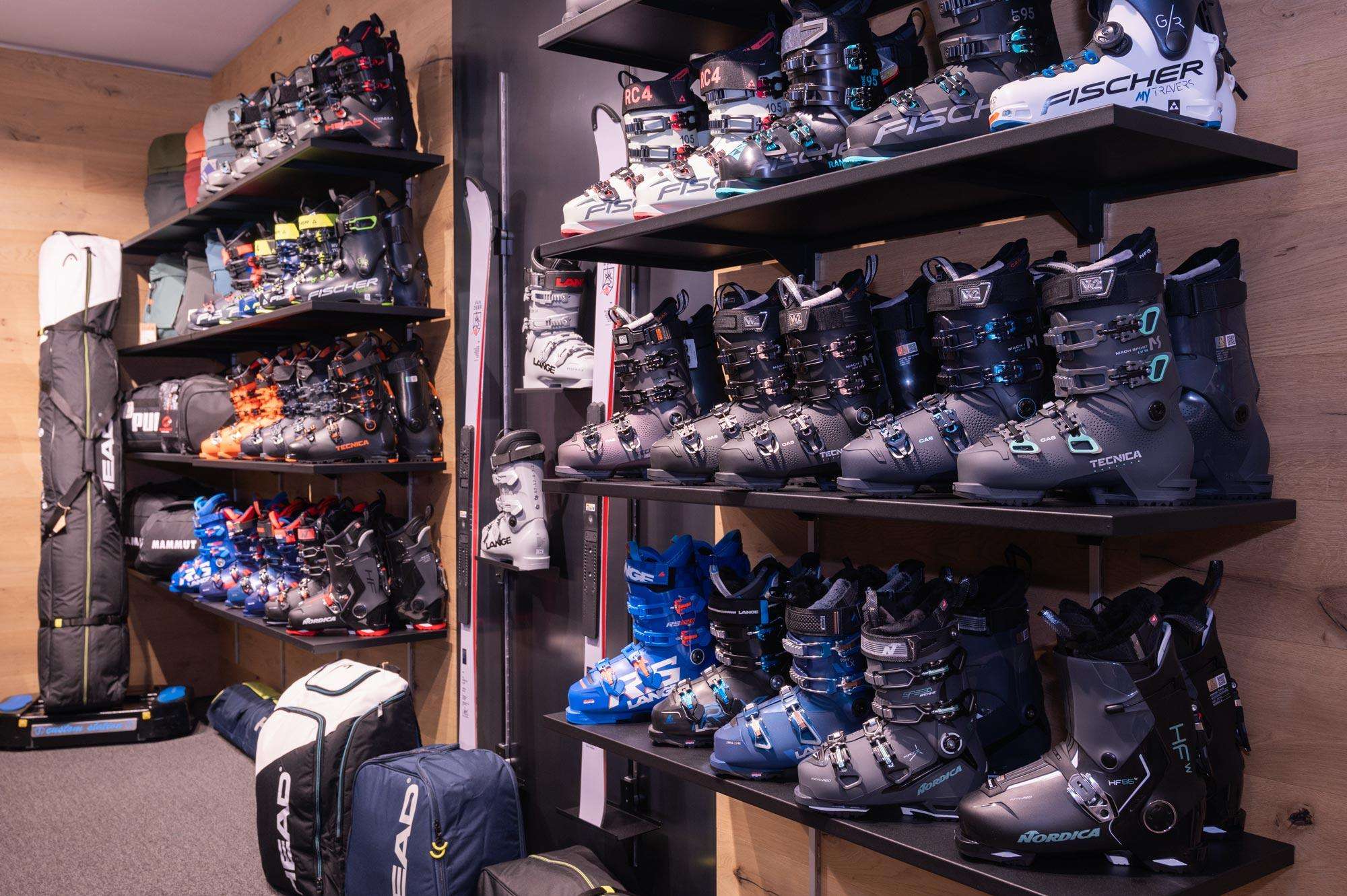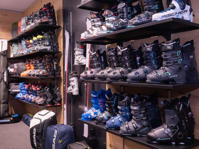 Im Untergeschoss erwartet Dich eine sorgfältig ausgesuchte Auswahl an Schuhen und Sportartikel der Marken Head, Molitor (made by Stöckli) Atomic, Van Deer, Kessler, Tecnica, Fischer etc. sowie unseren Verleih und Service.