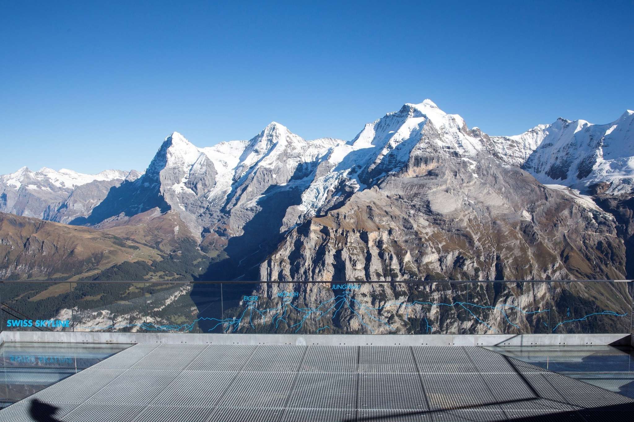 Die Panorama-Plattform Skyline Walk lädt zum Rundgang mit Nervenkitzel ein: Direkt an die Birg-Terrasse angebaut führt die Plattform über den senkrechten Abgrund und gibt den Blick über das Panorama bis ins Bodenlose frei. Die Konstruktion, vorwiegend aus Stahl und Glas sowie einem Boden aus Gitterrosten, fügt sich durch ihre eckige Form nahtlos in die Landschaft rund um die exponierte Station Birg und die kantige Felslandschaft ein.