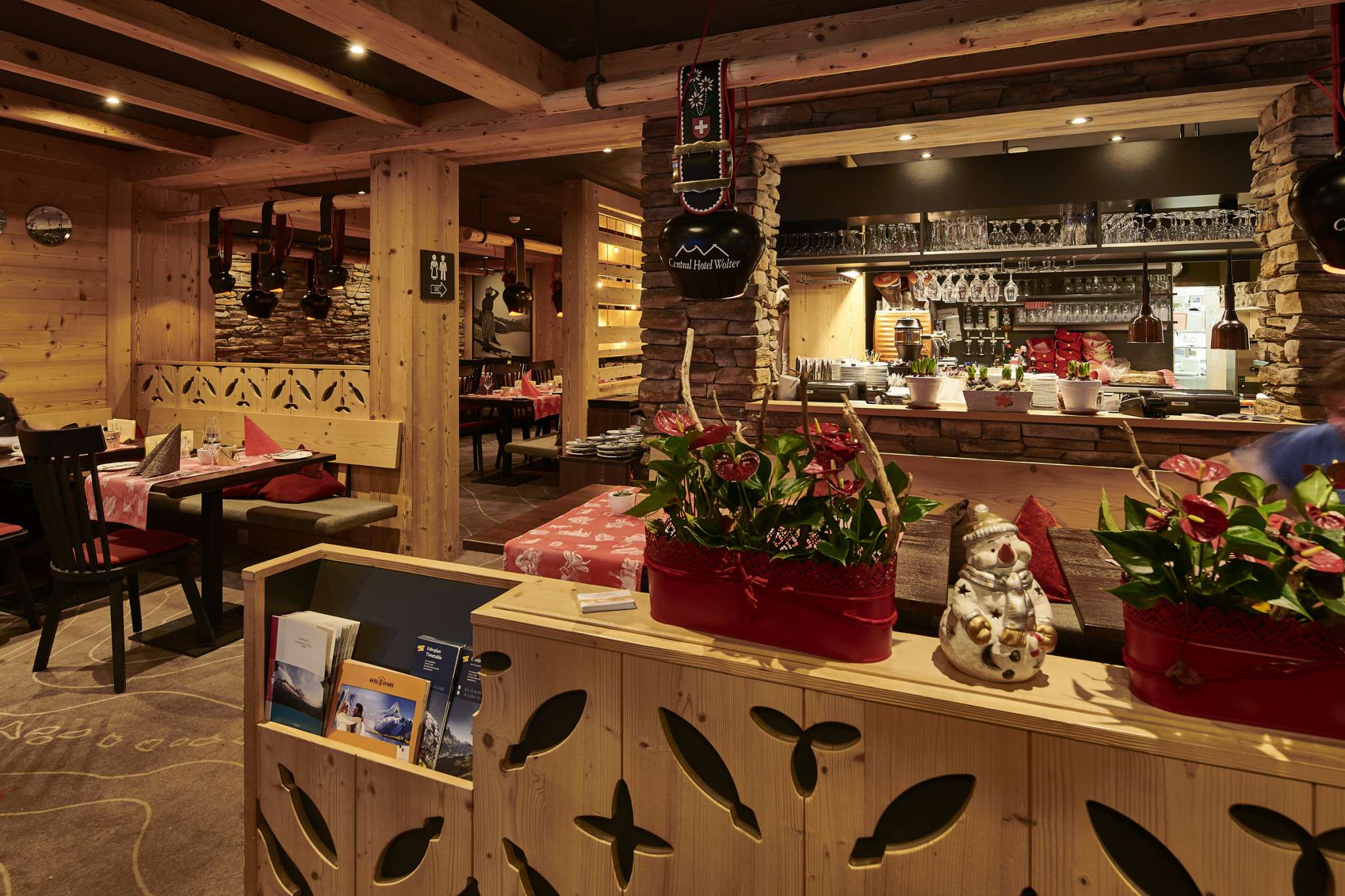 Im gemütlichen und rustikalen Restaurant werden Sie mit internationalen und traditionellen Spezialitäten verwöhnt. Auf der beheizbaren Boulevard-Terrasse scheint für Sie die Sonne schon am Morgen, beim Kaffee mit herrlichem Blick auf den Eiger.
