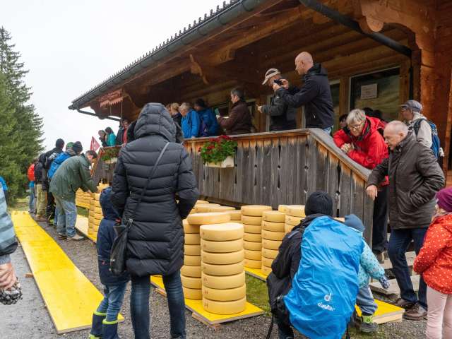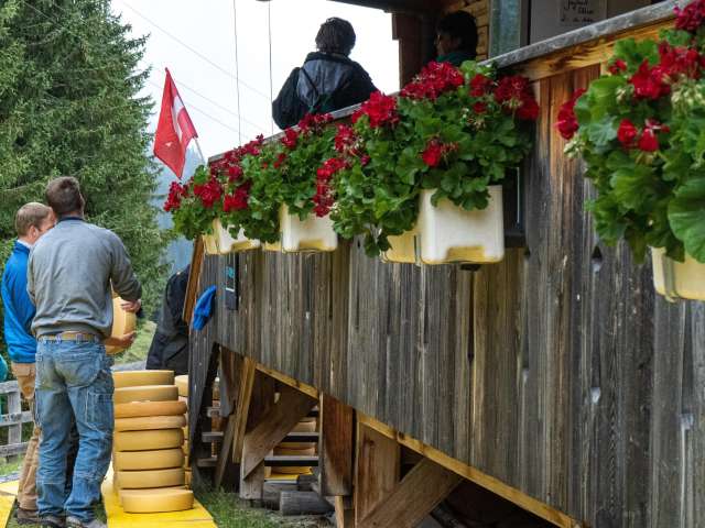 Der Käse der auf der Alp während dem Sommer produziert wurde, wird an die Bauern verteilt, die Ihre Kühe für den Sommer auf die Alp gebracht haben. Verkaufstand mit den Alp-Produkten, Festwirtschaft ,Folklore Musik mit dem Jodlerclub