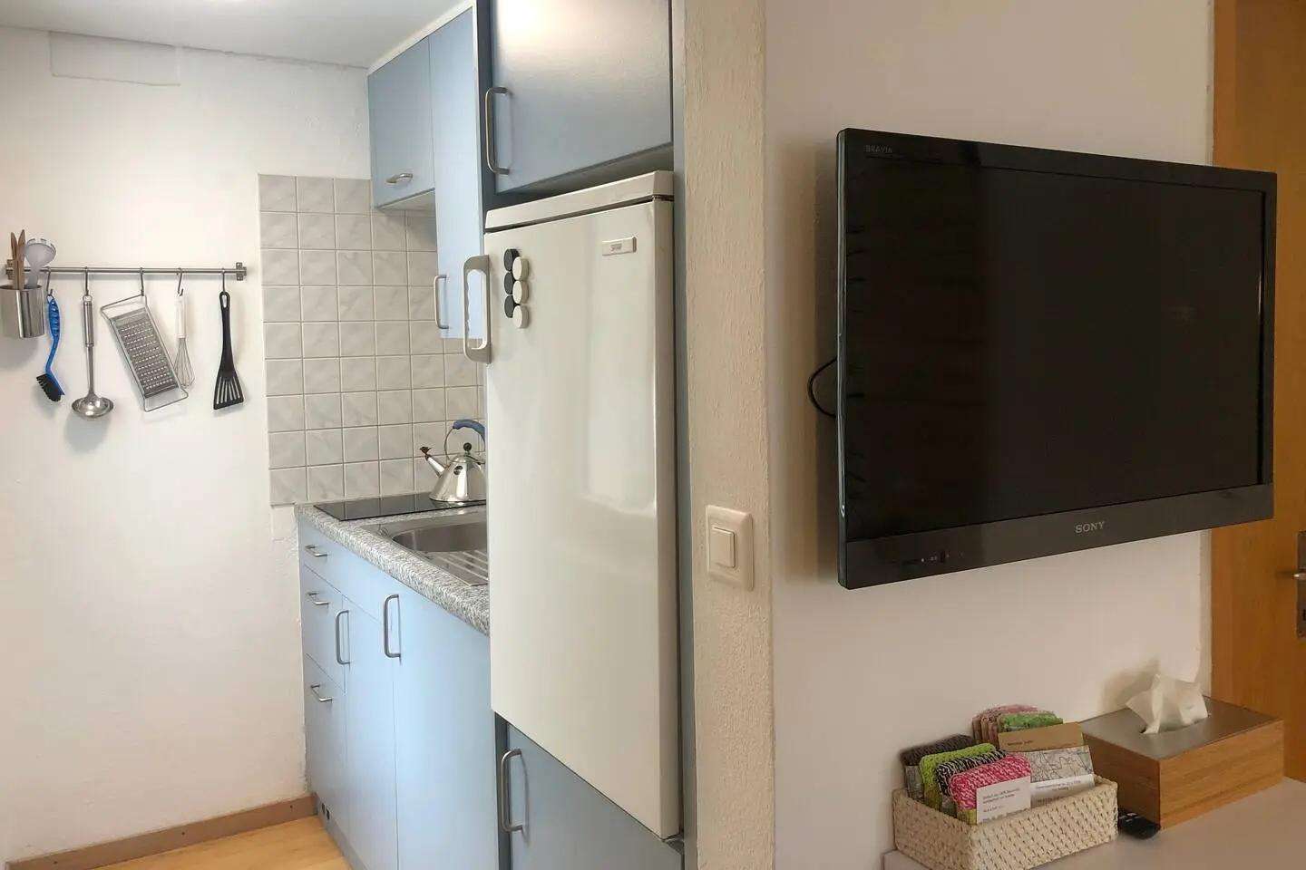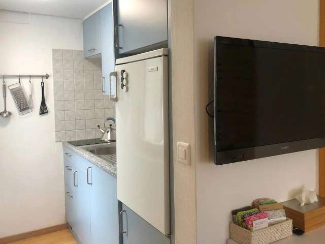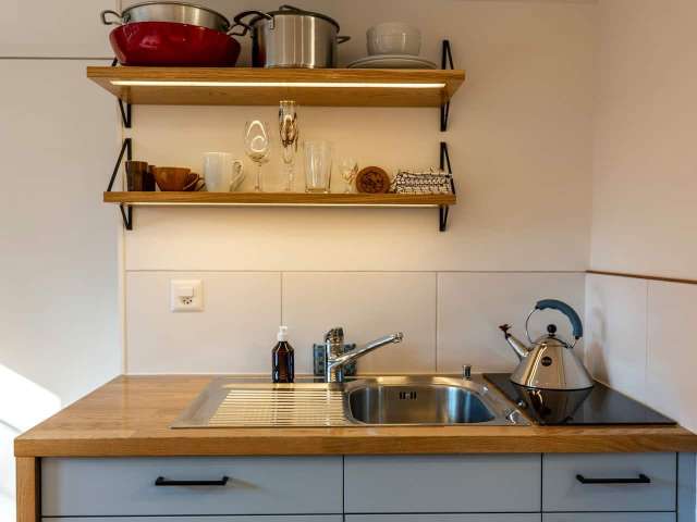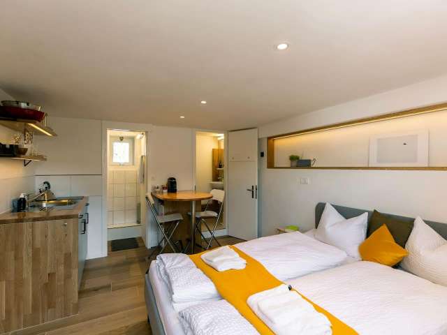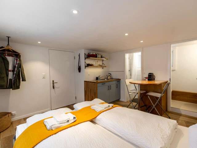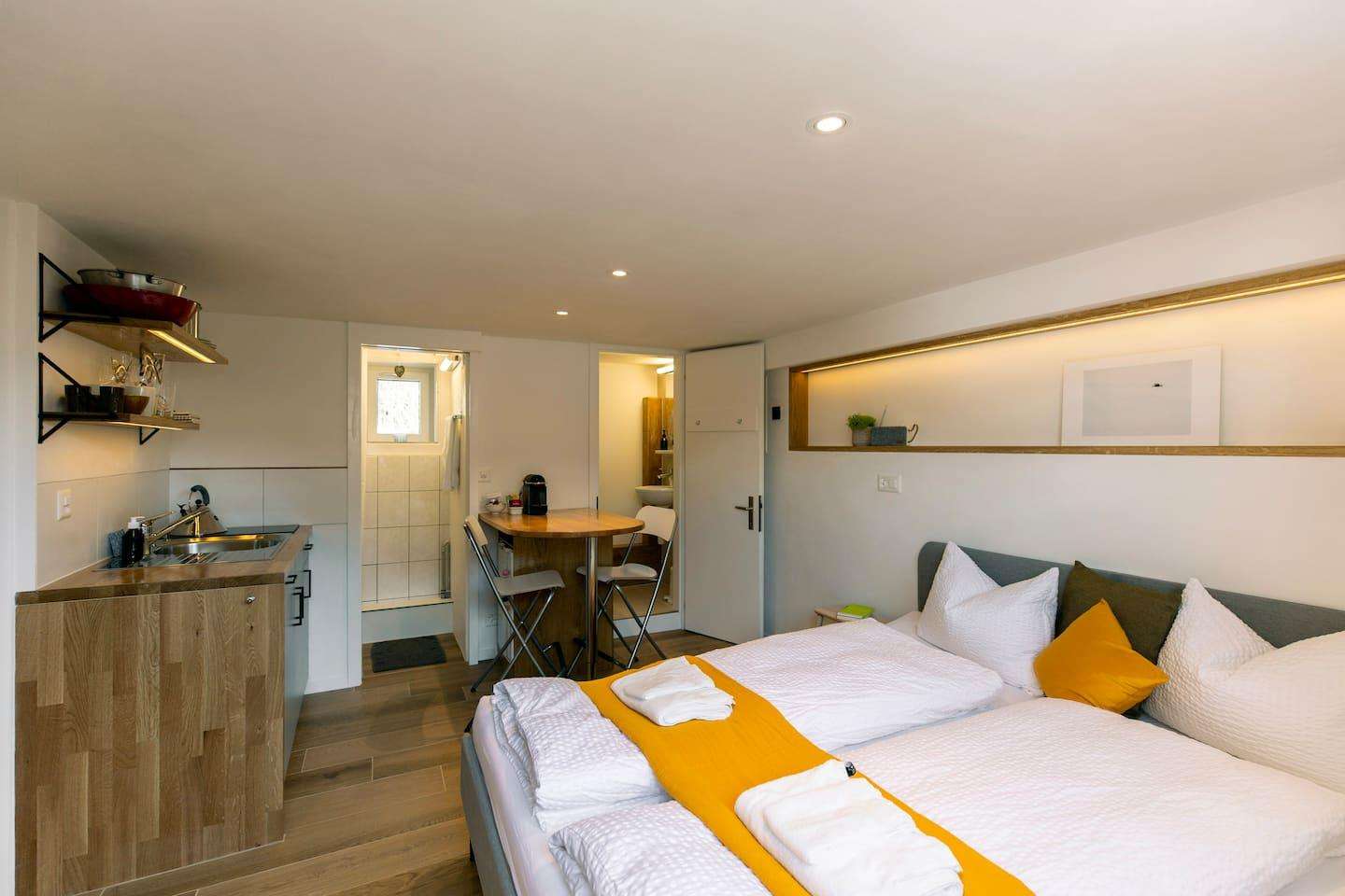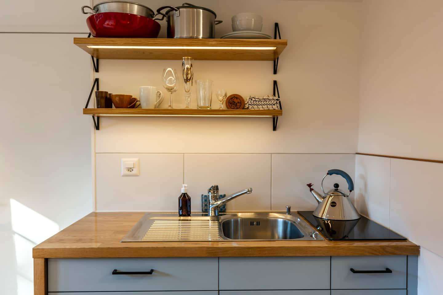 Moderner und supergemütlicher Raum mit Fußbodenheizung. Perfekt für zwei Gäste. Privater Eingang, Queensize-Bett (160 cm x 200 cm) mit zwei Bettwäsche- und Bettdeckensets, Küche, Esstisch und Stühlen, Badezimmer und Dusche. Die Küche ist mit einem kleinen Kühlschrank, einem Zwei-Flammen-Herd, Töpfen, Pfannen, Geschirr, einer Nespresso-Kaffeemaschine, Kaffeepads, Tee und einem Wasserkocher ausgestattet.