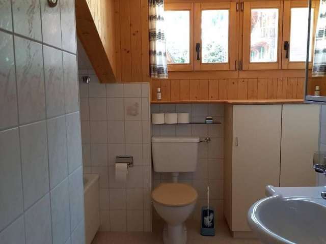 Nebst dem Wohnzimmer hat es in einem Schlafzimmer zwei hintereinanderliegende Betten, im anderen Schlafzimmer ist ein Einzelbett von 120 cm Breite. Die Küche ist zweckmässig ausgerüstet. Das Bad verfügt über ein WC, eine Badewanne zum Duschen und 2 Lavabos.