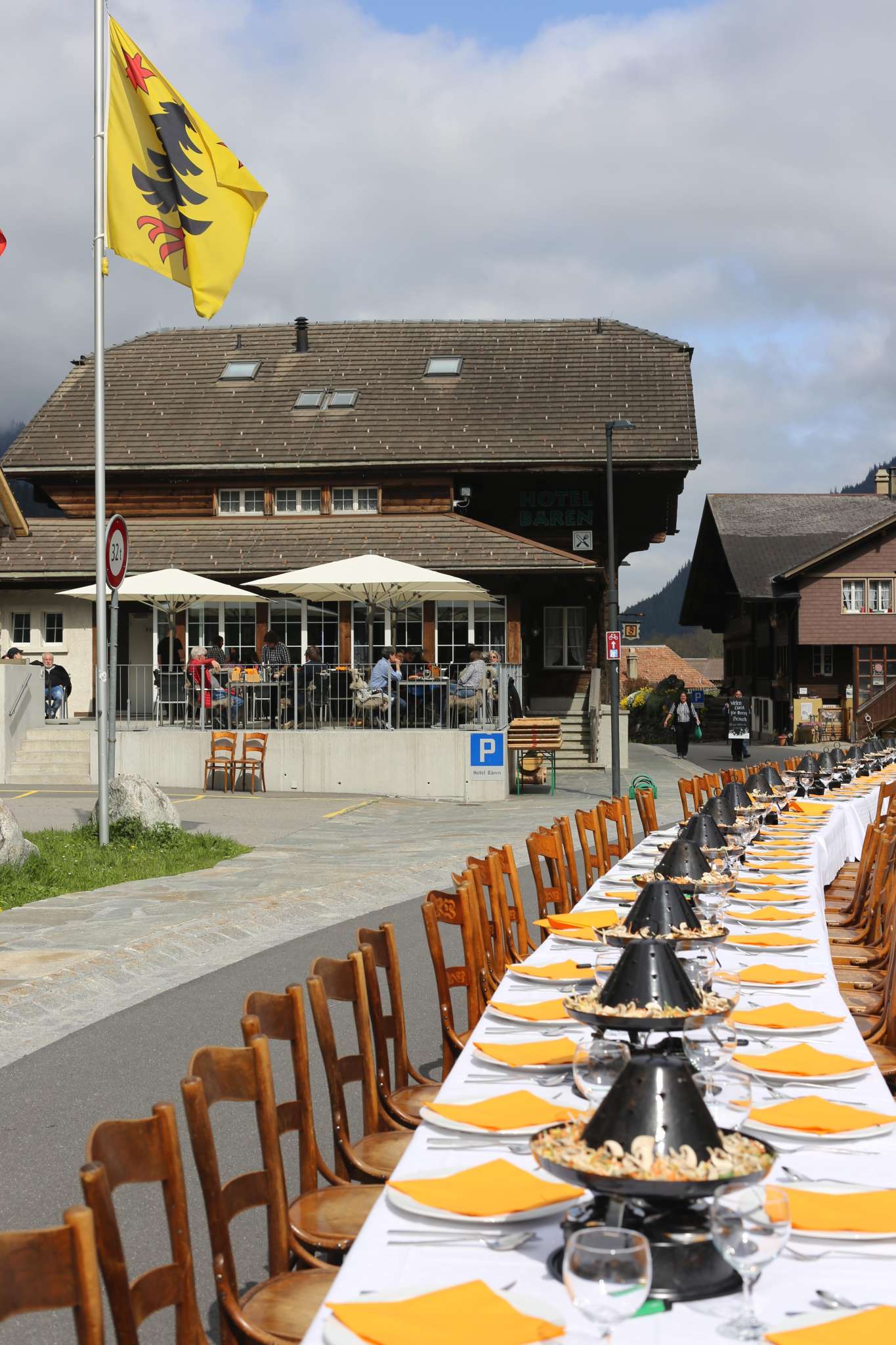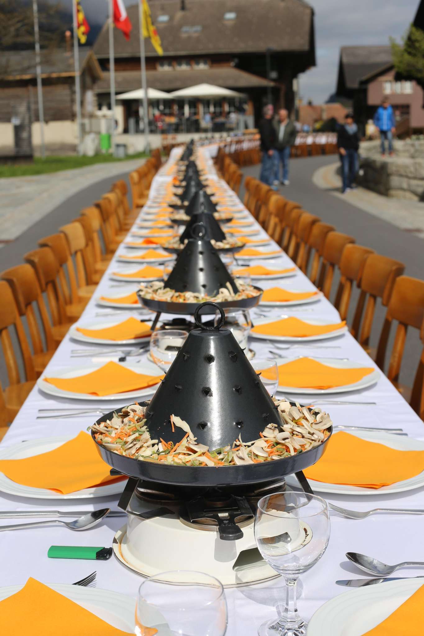 Auch im 2026 hoffentlich wieder draussen! Gemeinsam geniessen wir gegrilltes Fleisch oder Grillkäse vom Tatarenhut, der Bären-Spezialität, auf der Guttanner Dorfstrasse. Dazu gibt es Gemüse, verschiedene Marinaden und Saucen sowie Pommes Frites oder Reis.