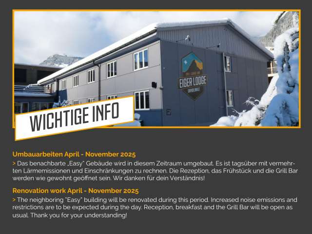 ***Wichtige Info: Die Eiger Lodge Easy wird von April bis Dezember 2025 umgebaut. In dieser Zeit bleiben die Easy Zimmer geschlossen. Die Eiger Lodge Chic wird normal buchbar sein. Es ist tagsüber mit Lärmemissionen und vereinzelten Einschränkungen zu rechnen. Die Rezeption, das Frühstück und die Grill·Bar werden aber wie gewohnt geöffnet sein. Wir danken für dein Verständnis!***