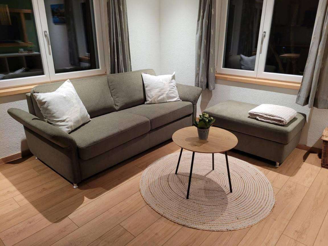 Im Wohnzimmer befindet sich einen Schlafcouch, den in ein Bett umgewandelt werden kann. Mass:140x200 cm