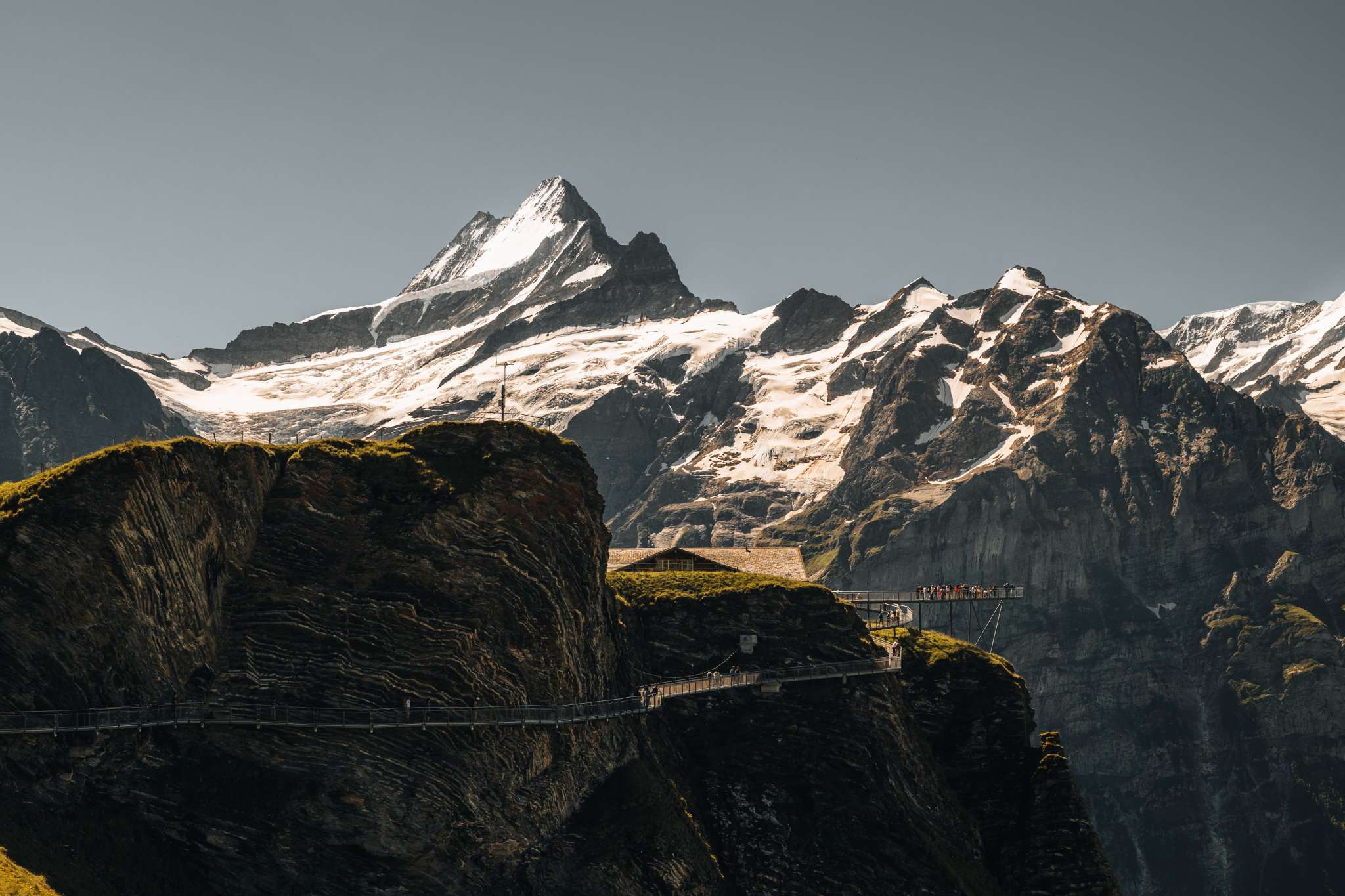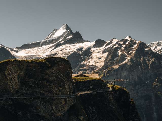 Die Alpendohlen auf First haben es gut: Sie kreisen über Alpweiden, Wald und einem hohen Wasserfall. Auf dem Aussichtssteg bei der Terrasse des Bergrestaurants ahnst du, wie sich das anfühlen muss – Nervenkitzel inklusive: Der Steg ragt 45 Meter hinaus ins Nichts. Um ihn zu erreichen, begibst du dich zunächst die Westseite des First-Gipfels in schwindelnde Höhen: Auf dem First Cliff Walk by Tissot ist nicht nur die Aussicht ins Tal zum Abheben schön, sondern auch die bergseitige: Die Felsen mit ihren Schichten und Nischen dienen den Alpendohlen als Start- und Landeplatz.