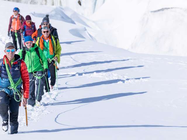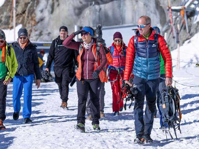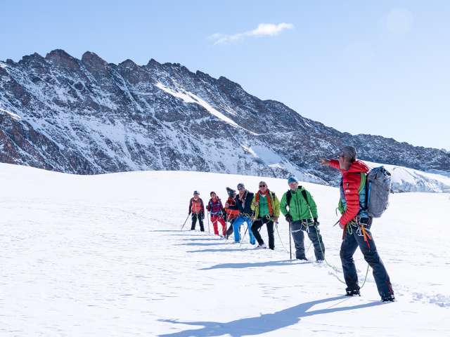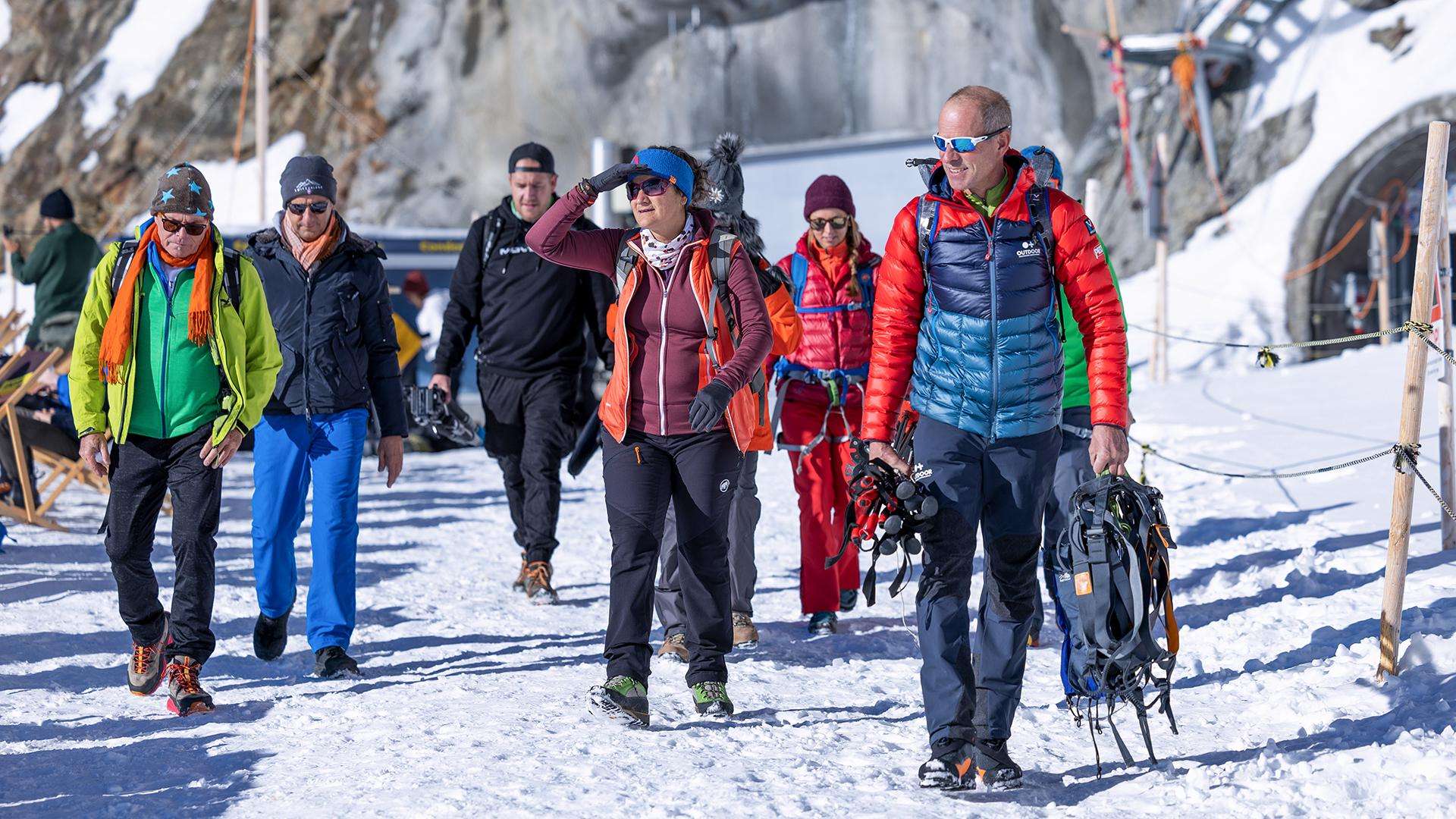 Für dieses einmalige Abenteuer holen wir euch am Treffpunkt ab und begleiten euch auf das auf 3'454 m ü. M. gelegene Jungfraujoch, der höchsten Bahnstation Europas. Angeseilt und ausgerüstet mit einem Klettergurt und einem Skistock führen euch unsere Bergführerinnen & Bergführer IVBV gekonnt über den Gletscher. Ihren Erfahrungsschatz und ihr Wissen über die Bergwelt im Allgemeinen und das Bergsteigen im Speziellen teilen sie jederzeit gerne mit euch. Die Gehdistanz und Gehgeschwindigkeit auf dem Gletscher können individuell an die Bedürfnisse eurer Gruppe angepasst werden. Nach einer Pause besucht ihr zusammen mit euren Begleitpersonen von OUTDOOR das imposante Bauwerk des Jungfraujochs. Ihr werdet beeindruckt sein von der weitläufigen Anlage, die mit viel Pioniergeist Ende des 19. Jahrhunderts geplant und in der Folge auf eindrückliche Art und Weise erbaut wurde.