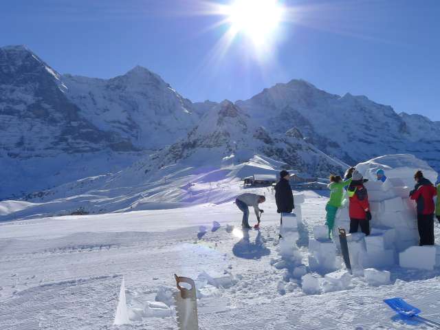 Unter fachkundiger Anweisung eurer OUTDOOR Guides baut ihr Block für Block euer eigenes Iglu. Die Baukunst der Inuit erfordert Ausdauer, Genauigkeit und Kooperation. Wir beginnen mit dem Aussägen der einzelnen Schneeblöcke aus dem von einem Pistenfahrzeug präparierten kompakten Schneefeld. Anschliessend legen wir die Schneeblöcke kreisförmig und gegen oben immer enger bis zum Abschluss der Iglukuppel aufeinander. Beim Genuss eines warmen Getränks könnt ihr euer neu erlangtes Fachwissen austauschen. Ein Apéro und/oder Abendessen rundet euer OUTDOOR-Erlebnis in der Jungfrau Region ab.