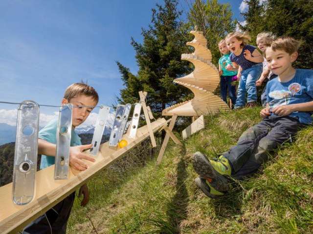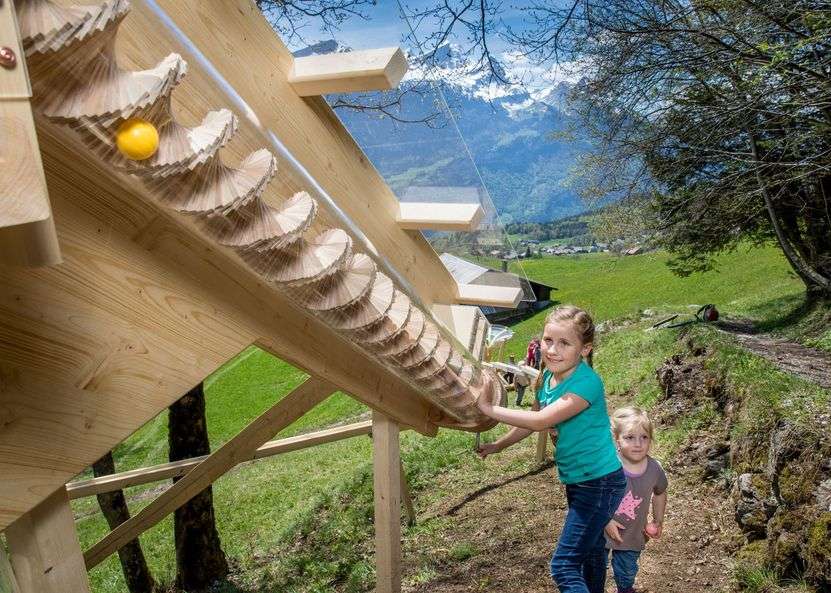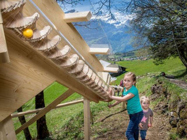 Entlang des Wanderweges von der Mittelstation Bidmi zur Talstation Reuti erwarten dich 12 spannende und abwechslungsreiche Kugelbahnen. Die Bahnen wurden von einheimischen Holzbaufirmen konstruiert. Die reine Wanderzeit von Bidmi nach Reuti beträgt rund eine Stunde. Der Wanderweg ist nicht kinderwagentauglich.