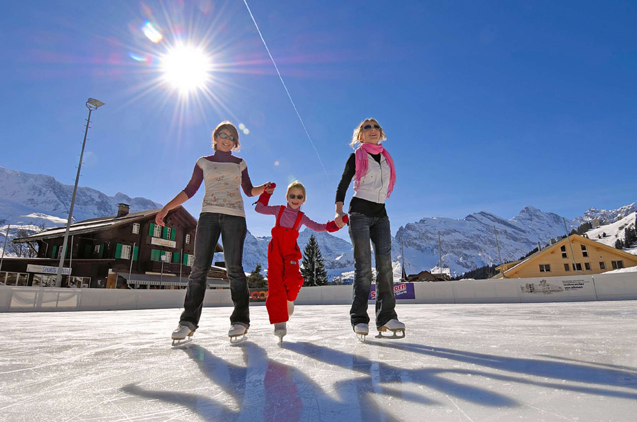 Die Kunsteisbahn unter freiem Himmel beeindruckt mit wunderschönem Bergpanorama im Hintergrund. Ob Schlittschuhlaufen, Eishockey, Curling oder Eisdisco – hier ist immer etwas los.