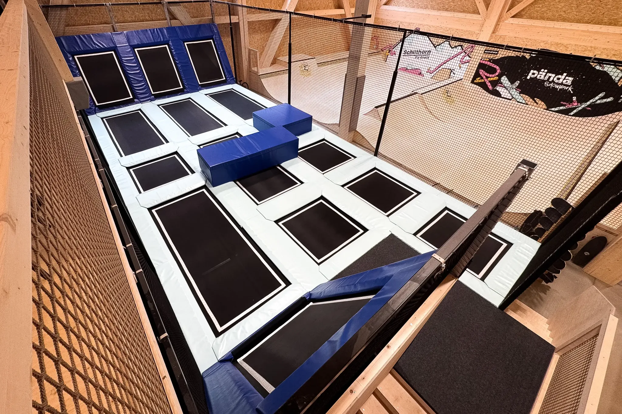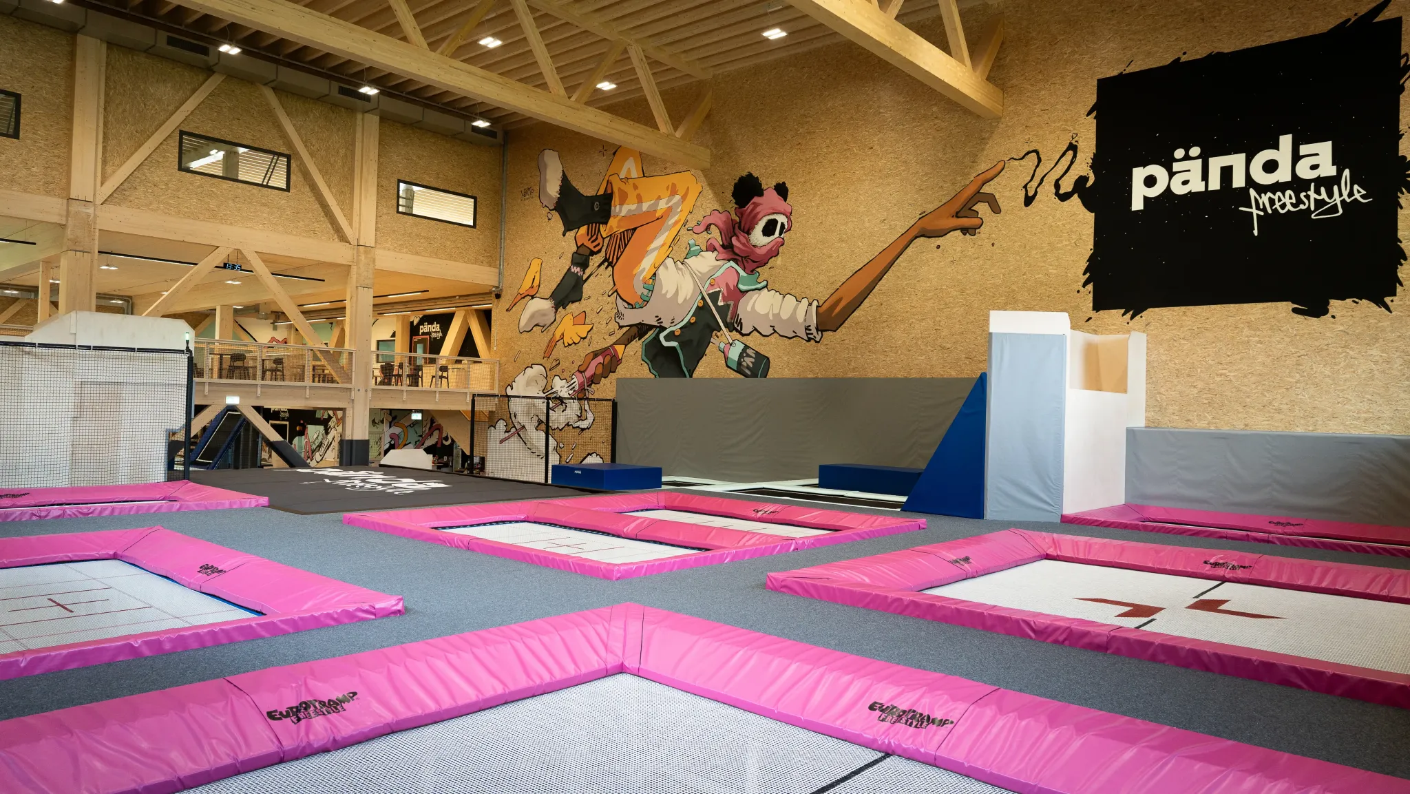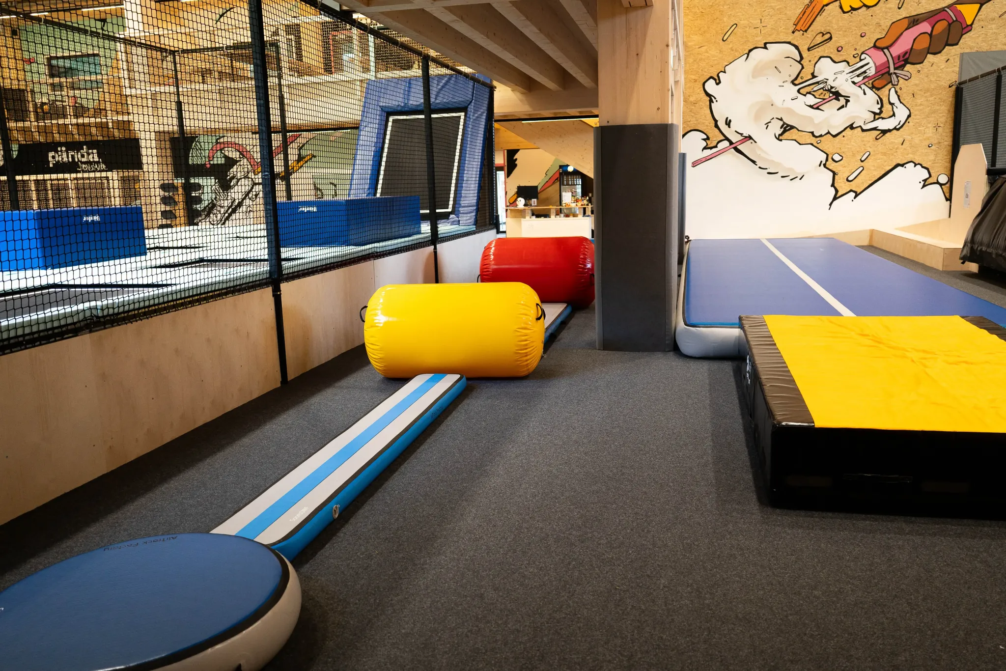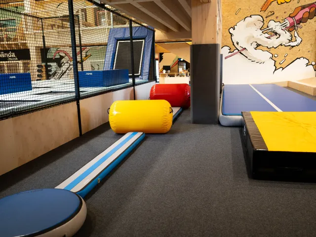 Die moderne, 1'000m² grosse Indoor-Anlage bietet ein vielseitiges Erlebnis rund um Bewegung, Sport und Kreativität. Ob auf den Fivesquare Trampolinen, vom Grandmaster oder Sprungturm in den Airbag, auf dem Airtrack im Multisportbereich oder auf der Skatefläche mit Double-Mini-Ramp, Spine und Extension – hier finden sowohl Einsteiger als auch Fortgeschrittene den perfekten Spielraum zur Entfaltung.