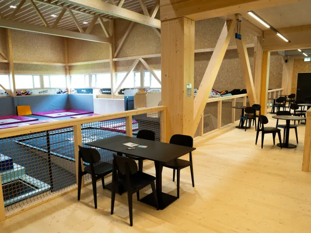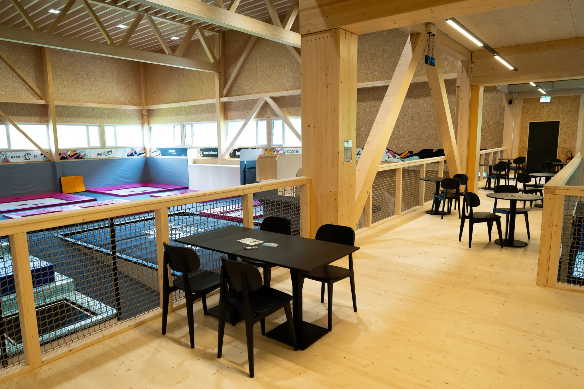 Neben dem Trampolin- und Rollbereich gibt es einen weichen Multisportbereich, der sich ideal für Yoga, Workshops, Parcours und freie Bewegung eignet. Zuschauer geniessen den Überblick über die gesamte Halle von der Galerie aus – inklusive Bistrobereich zum Verweilen. Die Kids toben sich aus, während die Eltern in Sichtweite zurücklehnen können. Hier kommt die ganze Familie auf ihre Kosten.