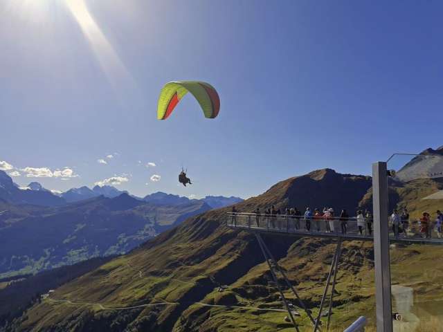 Gemeinsam mit deinem Tandempilot läufst du ein paar Schritte den Hang hinunter und schon schwebst du in der Luft und geniesst die spektakuläre Aussicht auf die Eigernordwand und die Bergwelt der Jungfrau Region.
