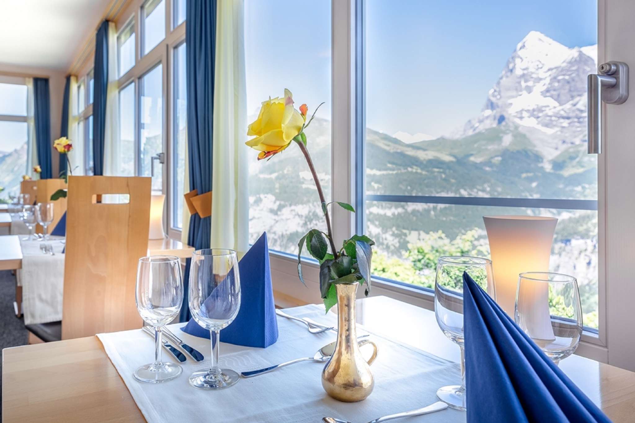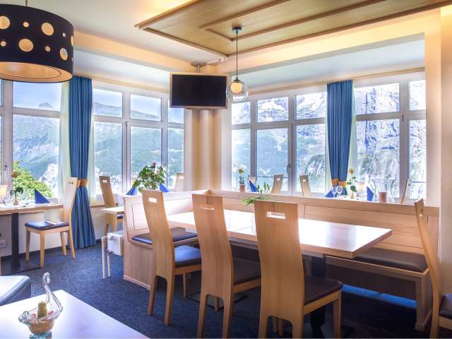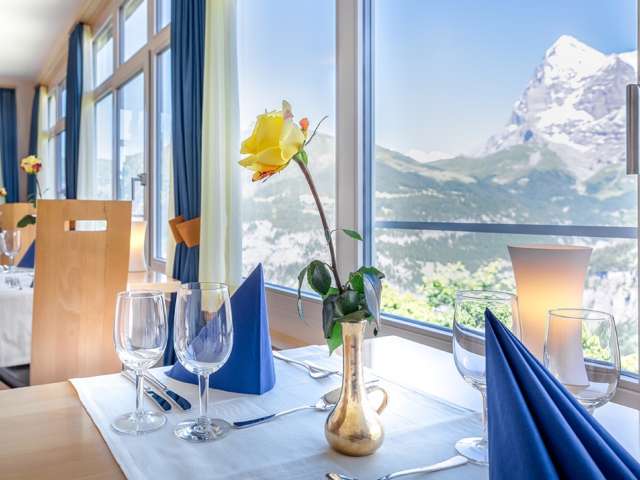 Das Restaurant im Hotel Alpina verfügt über einen geräumigen Speiseraum, in dem zahlreiche nationale wie auch internationale Gerichte serviert werden. Die Köstlichkeiten können dank den grossen Panoramafenstern mit direktem Blick auf Eiger, Mönch und Jungfrau genossen werden.