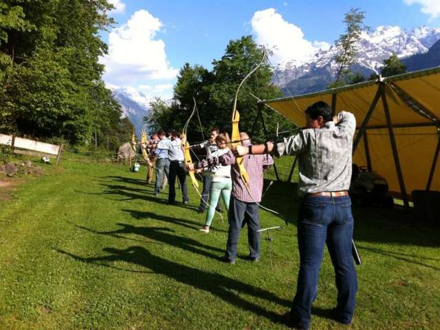 Konzentration, Körperwahrnehmung und Intuition sind Voraussetzungen, um mit Pfeil und Bogen ins Schwarze zu treffen. Sie lernen, intuitiv zu schiessen, das heisst ohne Ziel - Vorrichtung. Auch mit dem Blasrohr ist Ihr Gefühl für die Flugbahn des Pfeiles wichtiger als das klassische Zielen, welches beim Einsatz der Armbrust zum Zuge kommt. In dieser Olympiade absolvieren Sie die Disziplinen Bogen-, Blasrohr und Armbrustschiessen.