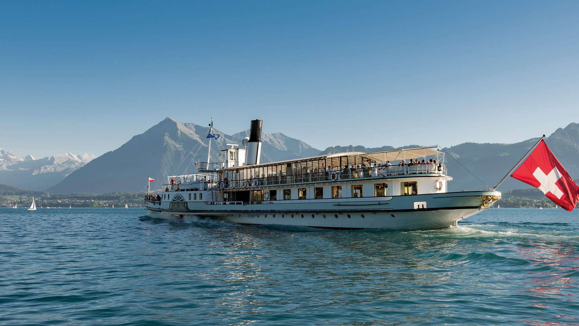 An Bord der modernen Motorschiffe oder des nostalgischen Dampfschiffs «Blüemlisalp» entfaltet sich die ganze Vielfalt der Region: sanfte Uferlandschaften, charmante Dörfer und fünf historische Schlösser, die direkt vom Wasser aus zu sehen sind.