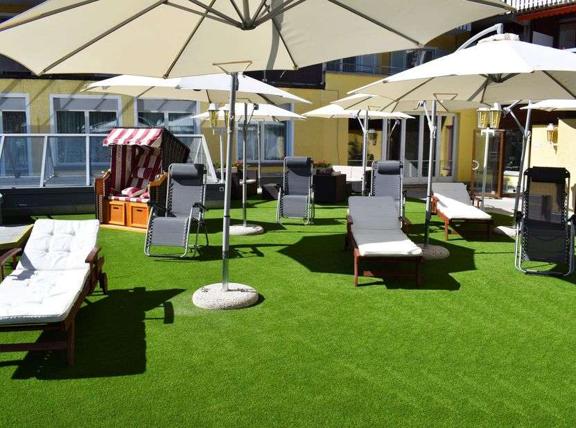 Im Sommer: Terasse mit Liegestühlen