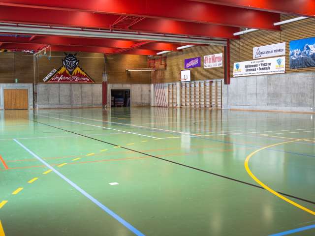 Die Dreifach-Turnhalle hat einen Kunststoff-Boden. Es stehen verschiedene Netze zur Verfügung, die nach Bedarf aufgespannt werden.