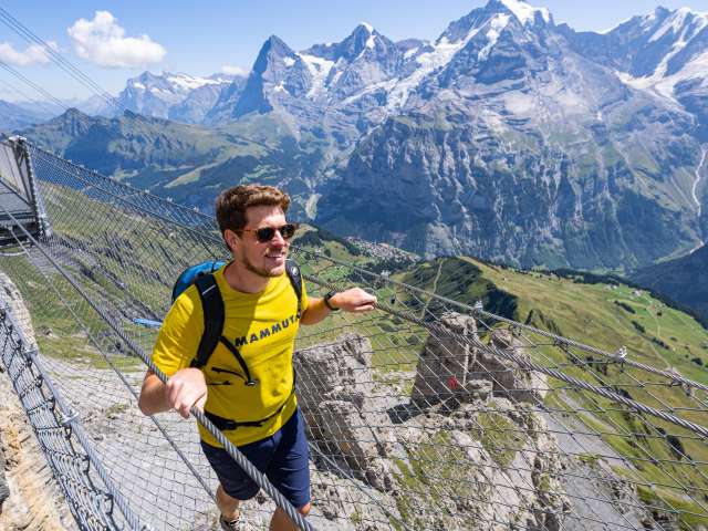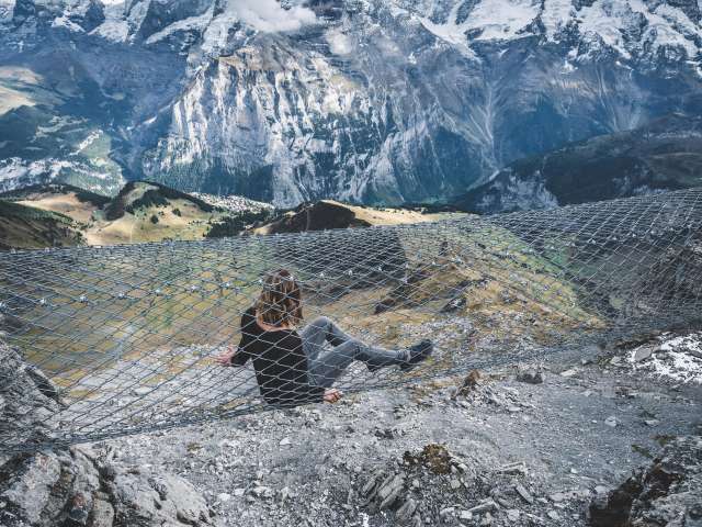 Wer sich von Mürren her auf den Weg Richtung Schilthorn macht, kommt nach der ersten Gondelfahrt bei der Mittelstation Birg an. Hier solltest du einen längeren Halt einplanen, um den Thrill Walk zu besuchen. Er garantiert allen, die es wagen ihn zu überschreiten, einen höheren Puls. Der rund 200 Meter lange Felsensteg wurde entlang des senkrechten Abgrunds in den Fels gebaut. Die Konstruktion aus Stahl und Glas sowie einem Boden aus Gitterrosten, fügt sich nahtlos in die kantige Felslandschaft ein. Für den Besuch des Thrill Walks solltest du etwa 45 Minuten einplanen, damit du auch noch genügend Zeit hast hast, ein paar spektakuläre Fotos zu schiessen. Neben dem Gitterrost, aus dem der Steg und die Treppe grösstenteils bestehen, gibt es rund 20 Meter Glasboden, Viehrostboden-Elemente und eine neun Meter lange Seilbrücke samt Sicherheitsnetz. Ein acht Meter langer Kriechtunnel vervollständigt das Erlebnis. Der Einstieg zum Thrill Walk befindet sich auf der Seite der Panoramaterrasse der Station Birg. Nach den 200 Metern voller Nervenkitzel erreichst du das weiter unten liegende Ende des Stegs. Von dort führt ein Schotterweg (im Winter schneebedeckt) hinauf zum Stationsgebäude.